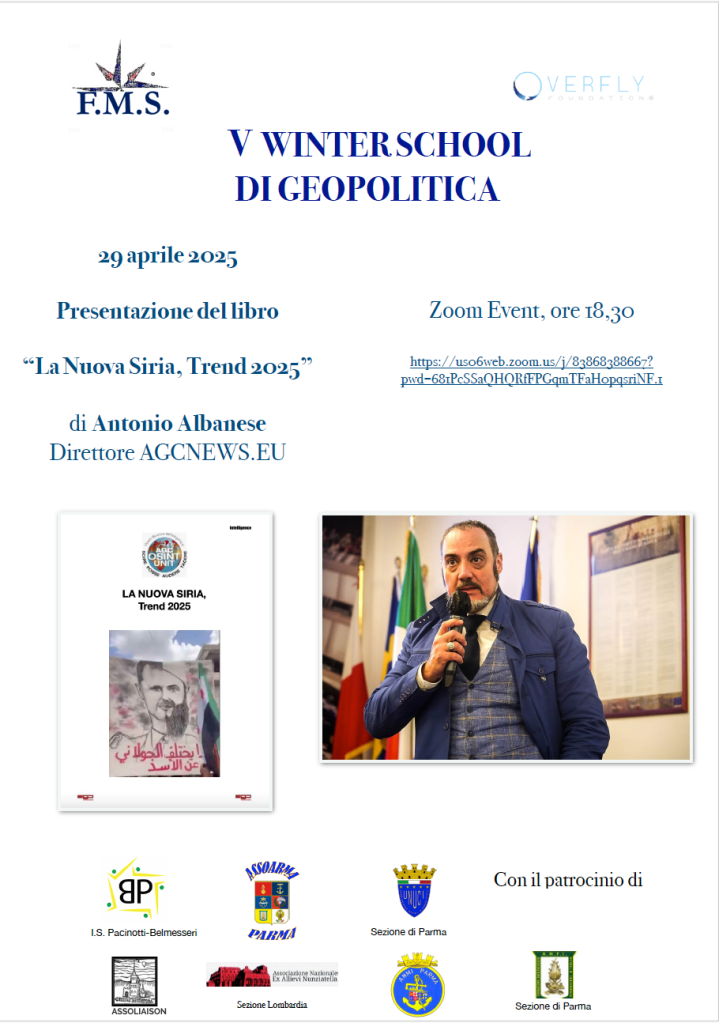 Parma. In data 29 aprile 2025, alle 18.30 sulla piattaforma Zoom, la “Winter School di Geopolitica FMS” diretta da Massimo Franchi ospiterà il Direttore di AGCNews.eu, Antonio Albanese, per la presentazione del libro “La Nuova Siria, Trend 2025” edito da AGCommunication e curato da Maria Elisabetta Papa e Cristina Uccello.